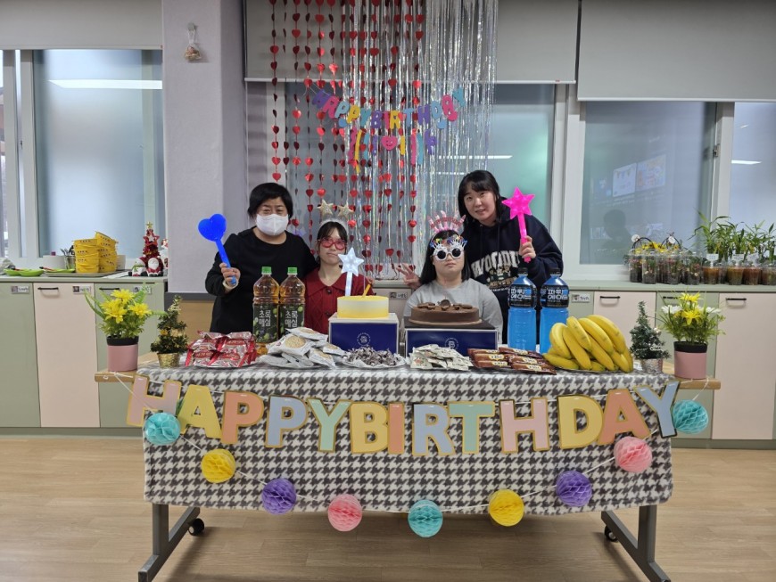 ❤ 내 용 : 도래샘주간보호소에서는 12월 생일을 맞으신 "이은서, 박지수" 이용자를 위해 생일 축하 노래 합창 및 생일 선물 증정식을 진행하였습니다. 파티가 끝난 후에는 다 같이 케이크&다과를 먹으며 오순도순 행복한 시간을 보냈습니다.