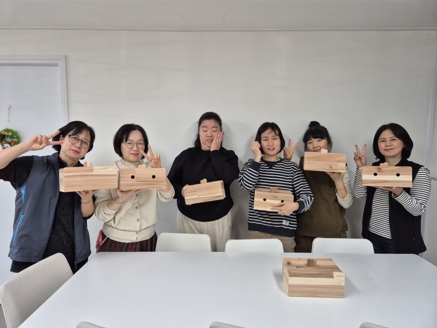 참여자들은 나무 조각들을 사포로 다듬고, 목공풀과 망치를 이용해 보물상자를 조립하며 섬세한 손놀림과 집중력을 발휘했습니다. 손잡이까지 부착하며 세상에 하나뿐인 나만의 보물상자를 완성하는 뿌듯한 시간을 가졌습니다.
