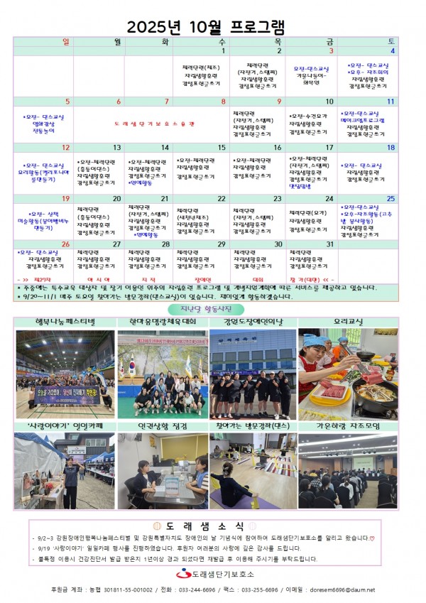 가을의 정취가 깊어가는 10월, 도래샘단기보호소에서는 이용인 여러분의 즐겁고 활기찬 가을을 위해 다채로운 프로그램을 마련했습니다.