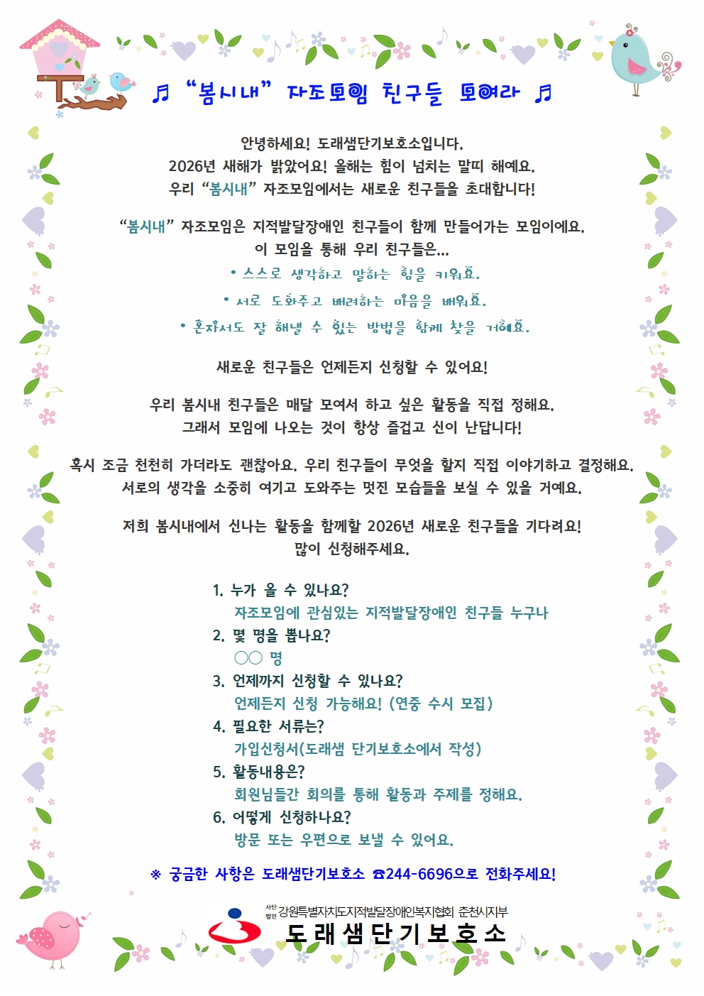 2026년 "봄시내" 자조모임 신입회원 모집 안내
